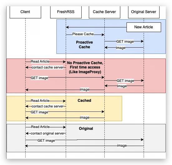 一般都用手机Reeder访问Freshrss,手机上面打开的时候却不生效,这是为什么呢?结合上面说的有两个插件,一个是ImageProxy一个是ImageCache,看了ImageCache的Github里面的用户访问时序图。