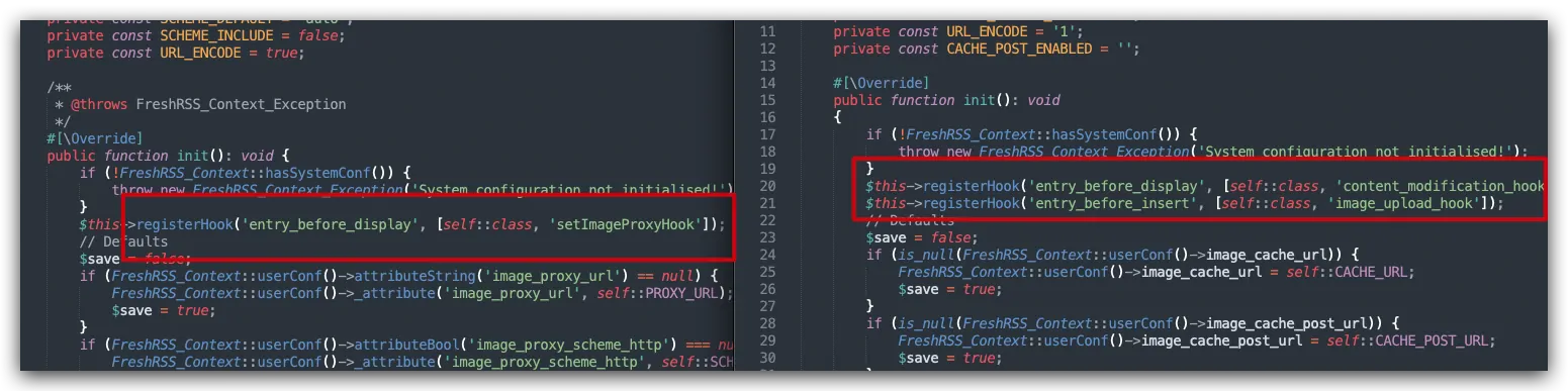 发现这个插件在客户端访问的时候可以直接读取cache而不是读取Freshrss,于是对比了下两个插件的代码,发现主要的区别在于Hook.
